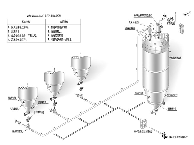 Negative pressure conveying system: The advantage of negative pressure dilute phase pneumatic conveying is that it is easy to retrieve materials and suitable for situations where no dust is required for material retrieval; Suitable for situations where material is taken from low, deep, narrow sampling points, or when feeding is concentrated from several locations to one location; Due to the gas source being located at the end of the system, lubricating oil or moisture will not mix into the transported material; Due to the pressure inside the conveying pipe system being lower than atmospheric pressure, even if there is wear and gaps, the conveyed material will not leak; Due to the pressure inside the conveying system being lower than atmospheric pressure, moisture is prone to evaporate, making it easier to transport materials with high moisture content compared to pressure conveying.