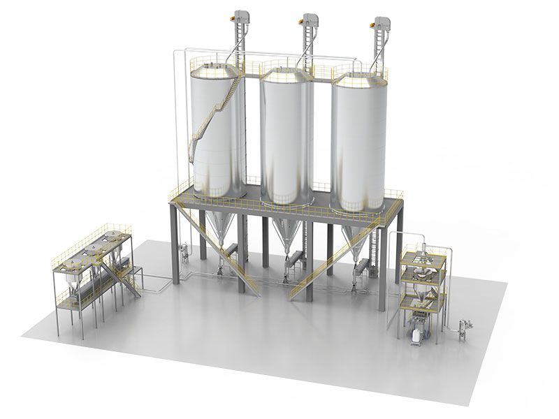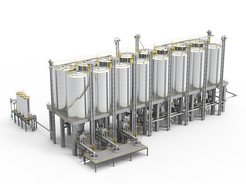 The slices prepared by the granulation machine are transported to the mixing bin through an air conveying system. The mixing bin can be divided into a central tube type or a wall mounted mixing bin according to the diameter of the bin. The material reaches the mixing chamber through the mixing tube, and the material in the mixing chamber comes from different heights and circumferential directions of the mixing bin. It is then circulated repeatedly through belts and buckets to improve the consistency of the material and ensure more stable and continuous spinning. The blended materials are transported to the spinning machine through an air delivery system, and the receiving end is equipped with a washing device to wash and separate the dust in the material. In recent years, we have provided multiple sets of blending and conveying systems for well-known domestic enterprises, such as Yuntianhua, Huafei, Dafa Shunxiang, Yingke, Huafeng, Peipu, etc.
